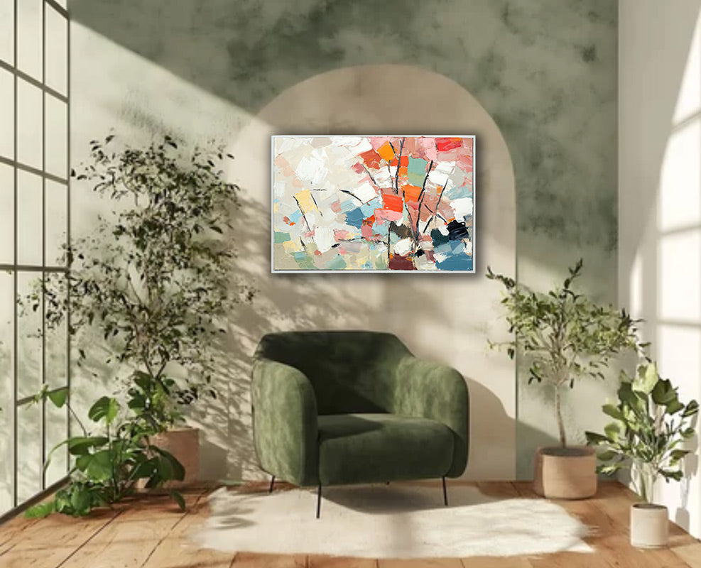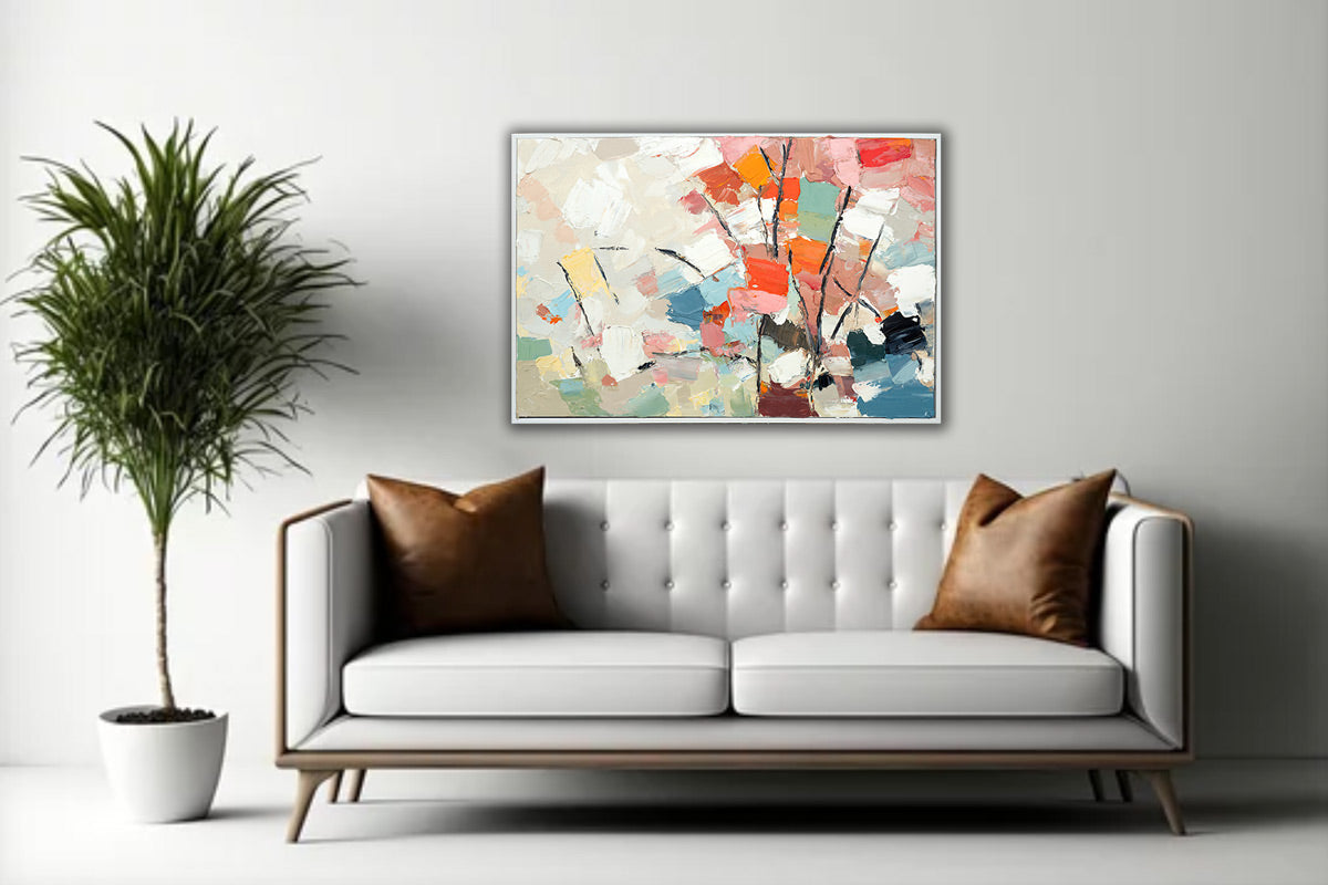 24x36" thick impasto oil painting, painted with palette knives, in a slim white floater frame.