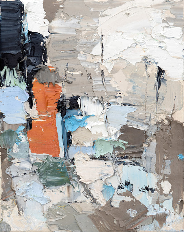 Thick impasto oil paint on 8x10" stretched canvas in a white floater frame.
