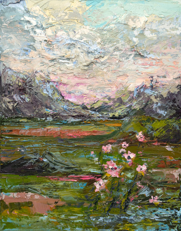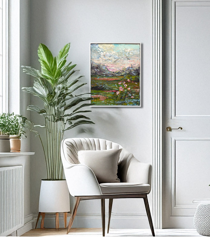 16x20" oil palette knife painting on stretched canvas, in a slim white floater frame.