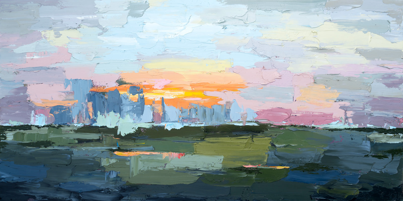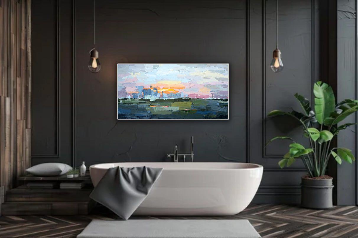 24x48" oil palette knife painting in slim white floater frame. Inspired by the skies on a hazy sun-drenched walk this past summer.